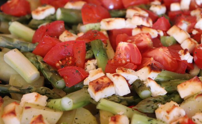 Ofenkartoffeln mit grünem Spargel, Tomaten und Feta